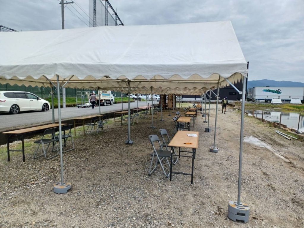 今回はどろんこバレーに参加される選手の更衣室に使うテントや参加されている方々が使われるイスや机を準備しました。